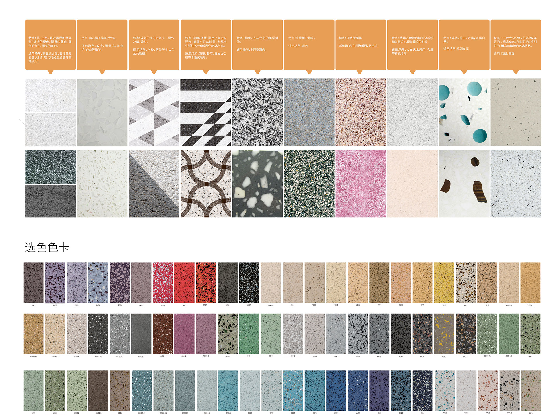 選用以再生透明玻璃、溶融石英、普通石英石、大理石碎石顆粒、可再生玻璃顆粒、陶瓷顆粒、玻璃鏡片、彩色玻璃顆粒、優(yōu)質(zhì)天然貝殼、馬賽克、鵝軟石等高環(huán)保材為主,并與骨材與高分子樹脂相混合,現(xiàn)場澆筑(攤鋪)、研磨、拋光等20多道精湛工藝技術(shù)。